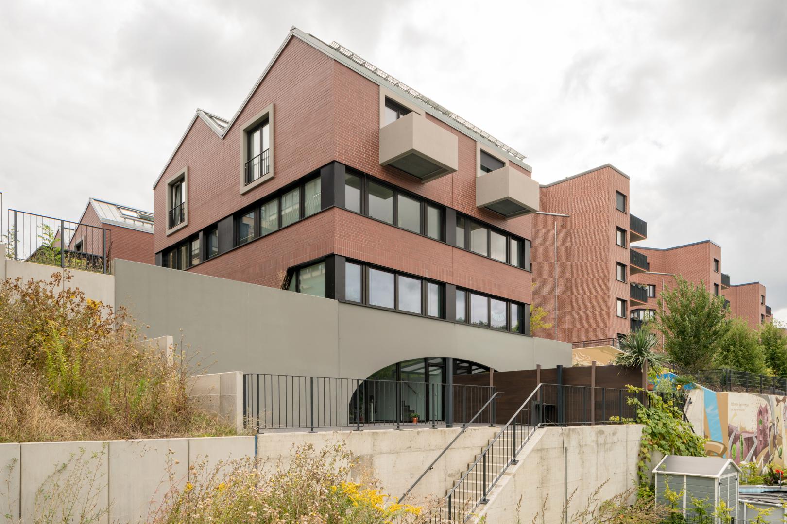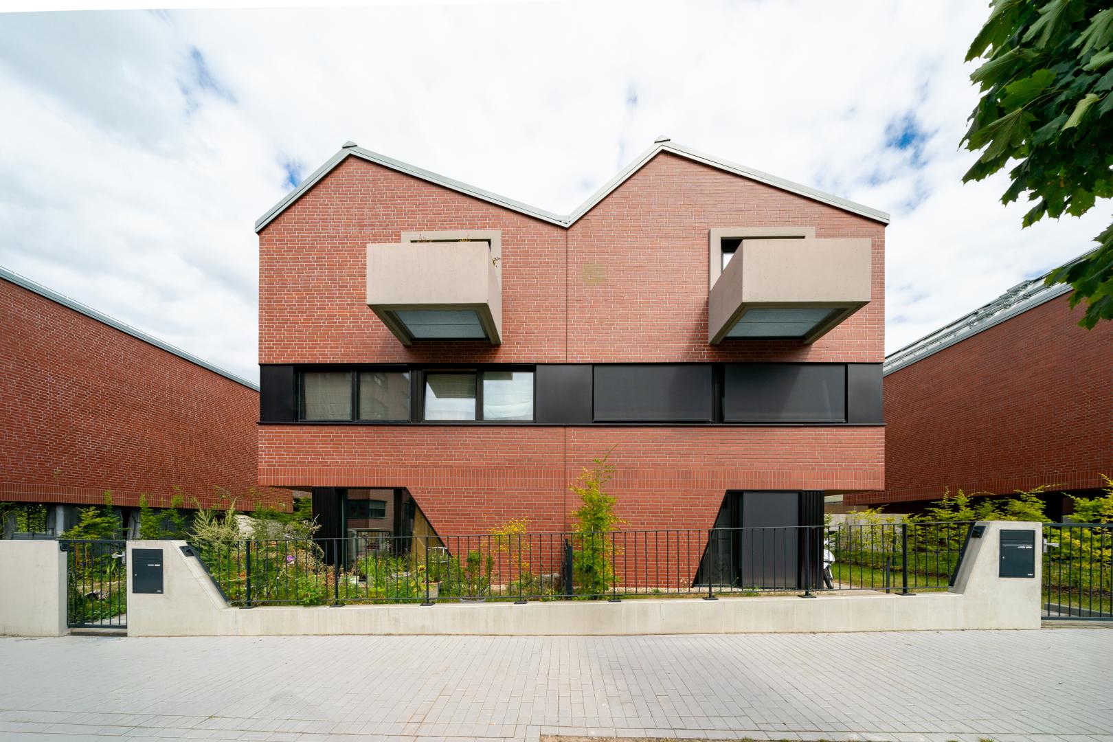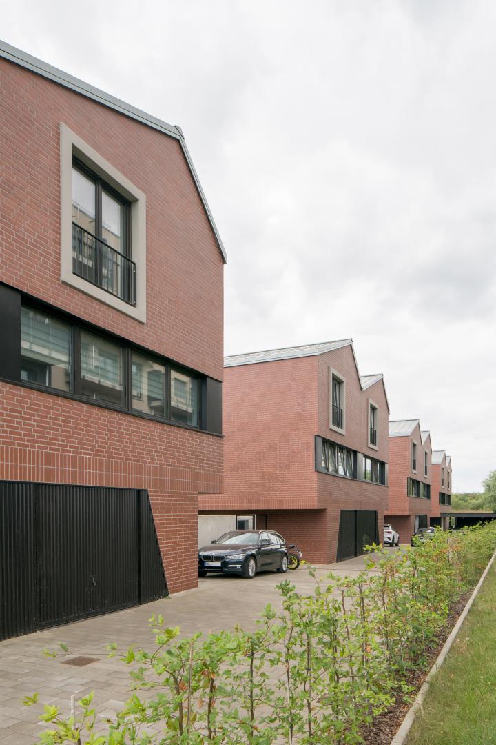 Ateliers – vier Häuser reihen sich aufgestelzt wie Fragmente eines langen Hafengebäudes vom Böllberger Weg bis zur Saaleaue. Der Rhythmus der Sheddächer, die langen Bandfenster und die Verwendung von recyceltem Backstein verweisen auf Typologien der Industrieepoche, wecken aber auch Assoziationen zum zeitgemäßen Stadthaus. Offene Wohnräume um eine zentrale, einläufige Treppe ermöglichen vielfältige Nutzungsszenarien und den langfristigen Generationswandel innerhalb einer Mietpartei. Die rückwertige, private Spielstraße verbindet die 8 Wohnhäuser zu einem Ensemble. Jedes Doppelhaus bekommt süd- und westseitig eingefriedete Gartenräume mit überdachten Bereichen. Die Kombination aus im Erdgeschoß untergebrachten Arbeitsräumen und darüber liegenden Wohnräumen ermöglicht eine flexible Nutzung auf kleiner Fläche. Zur Saale wird der Höhensprung des Ufers mittels Stützmauern abgefangen. Die ausgebildete Terrasse wird zum gemeinschaftlich genutzten Mietergarten mit weitläufigem Ausblick über den Fahrradweg hinweg zur Saalelandschaft